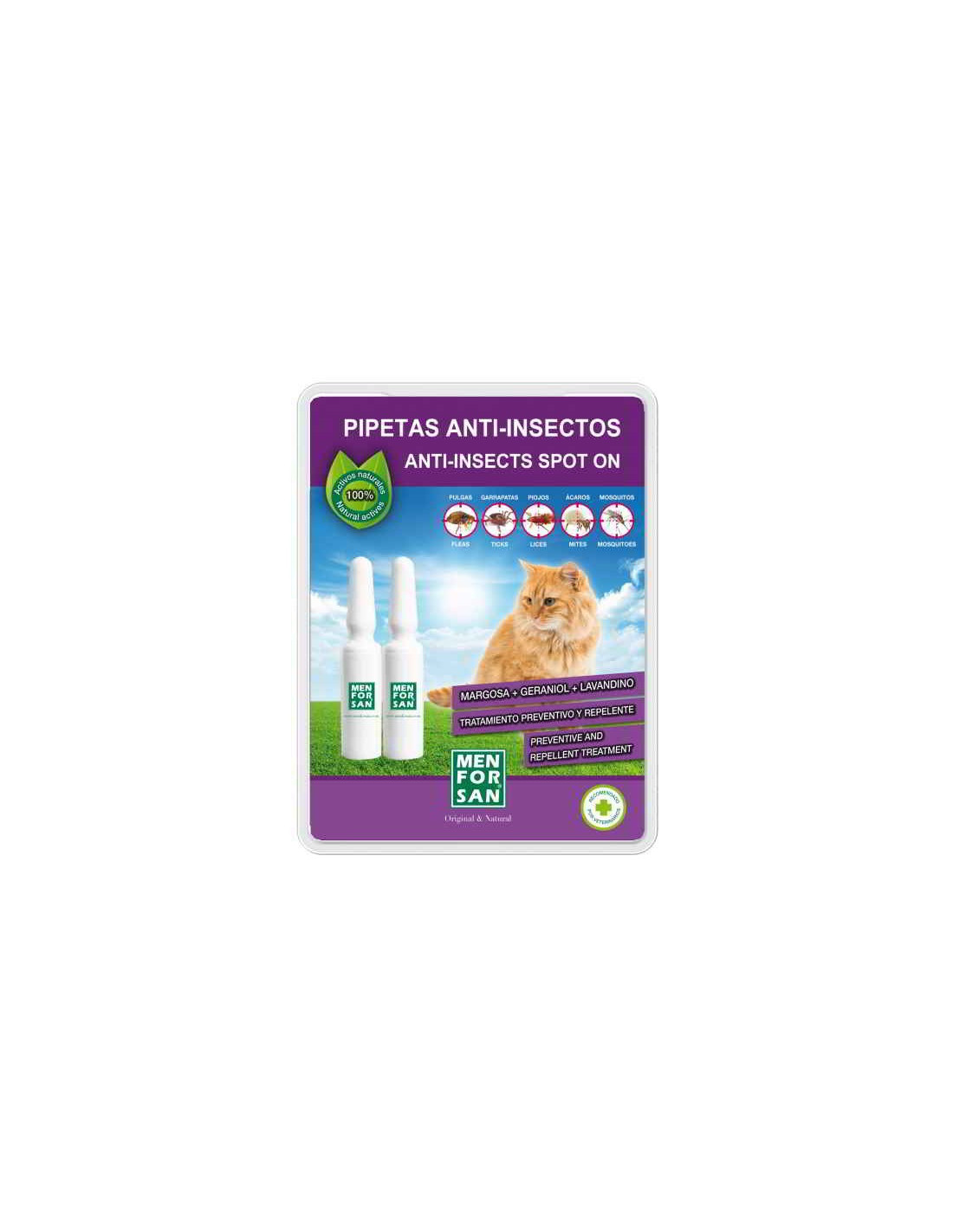 Pipeta anti-insectos para gatos con margosa, geraniol y lavandino menforsan. Contiene ingredientes naturales de alta eficacia (Margosa, Geraniol y aceite de Lavandino) para tratamiento preventivo y repelente de todo tipo de insectos (pulgas, garrapatas, piojos y mosquitos).