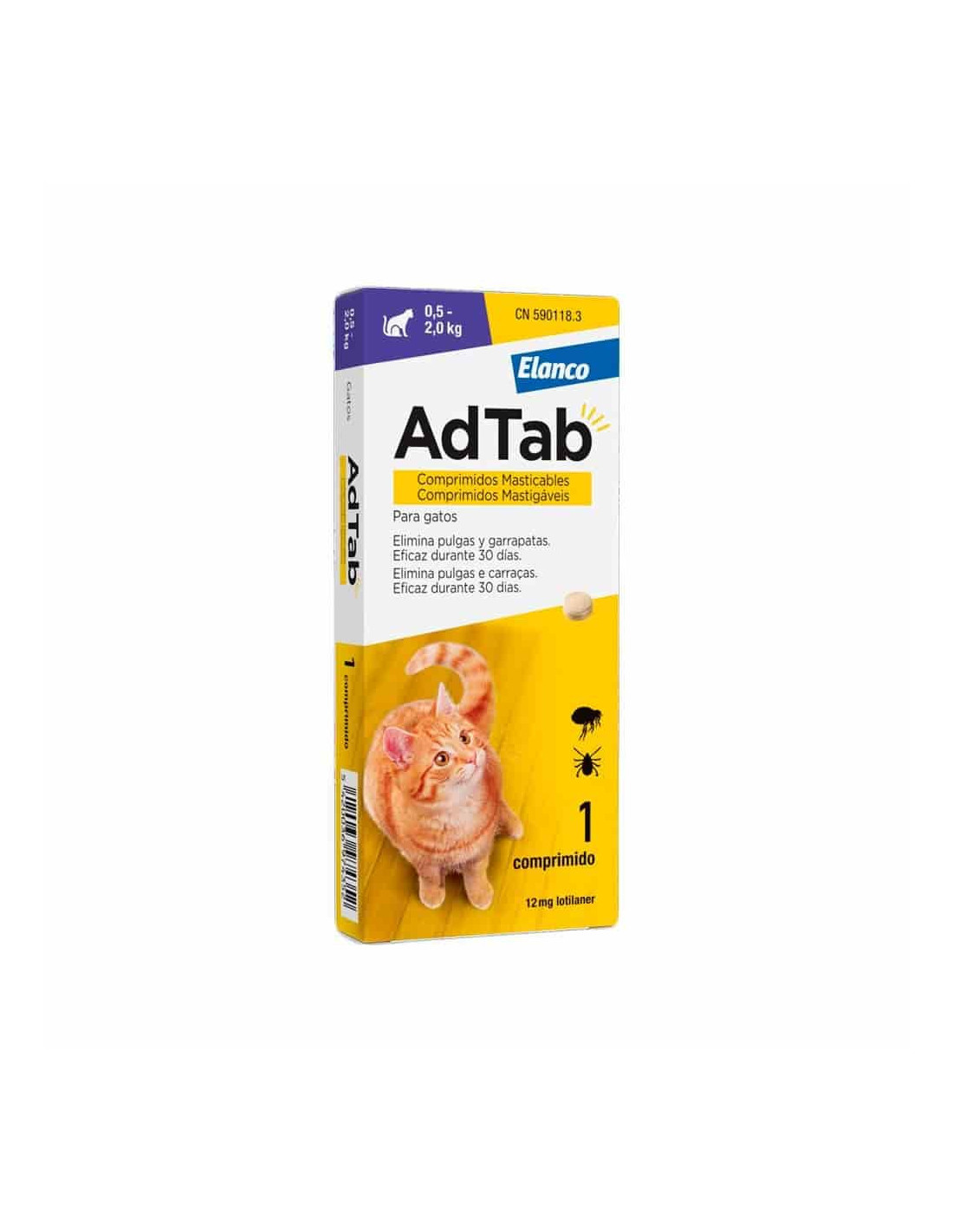 Adtab es un comprimido masticable antiparasitario para gatos de entre 0,5 a 2 kg, que elimina de forma rápido y eficaz las pulgas y garrapatas durante 30 días.