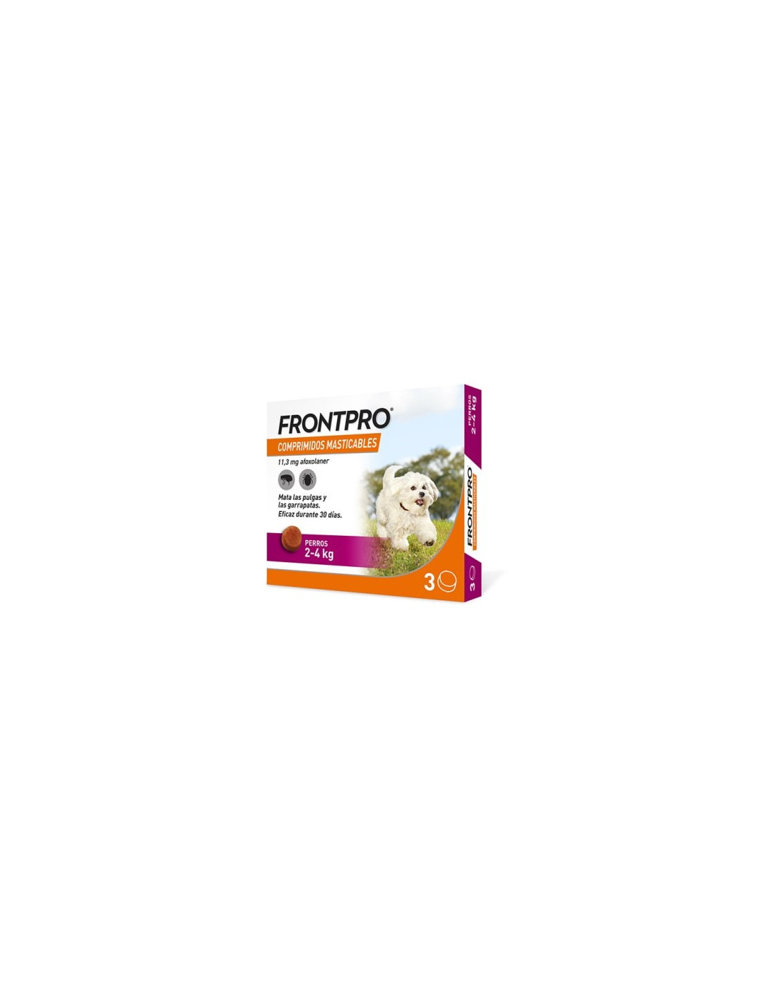 Frontpro de 2 a 4 kg, son comprimidos masticables para perros, que sirven para el tratamiento de las infestaciones de pulgas y garrapatas. La caja contiene un blister con 3 pastillas