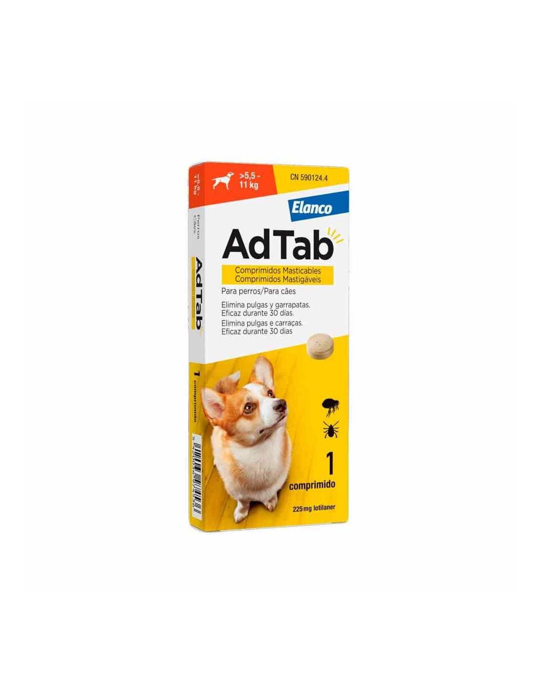 Adtab es un comprimido masticable antiparasitario para perros de entre 5,5 a 11 kg, que elimina de forma rápido y eficaz las pulgas y garrapatas durante 30 días.