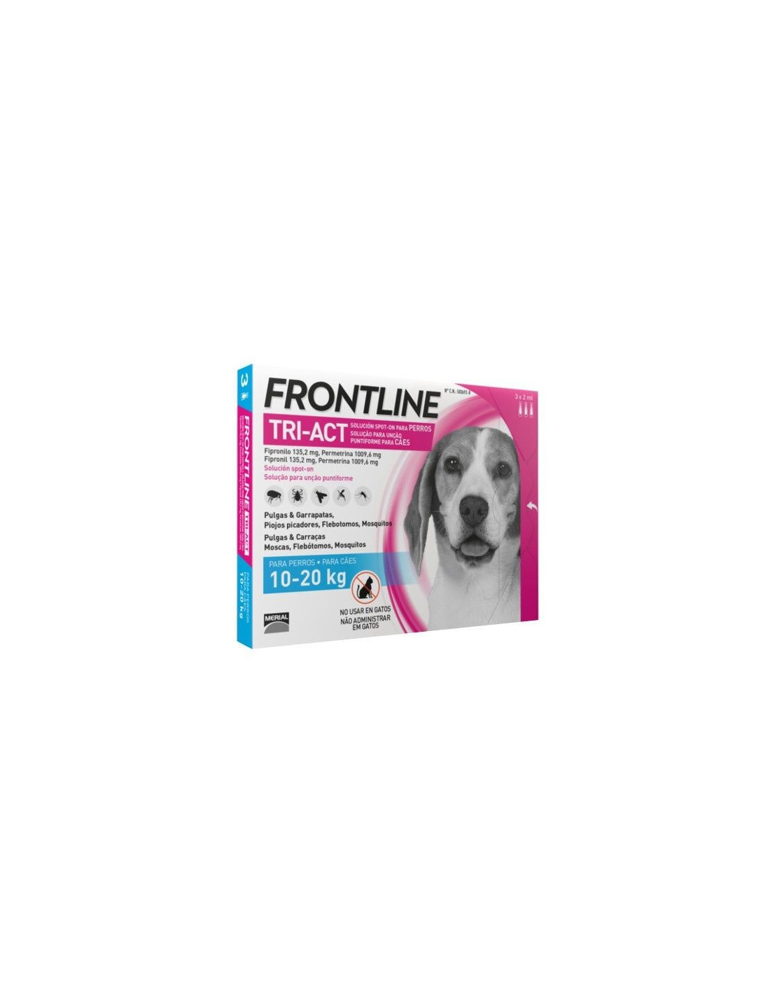 Pipetas FrontLine Tri-Act protección total para perros de 10 a 20 kg, es la nueva solución frontline de triple acción y nueva generación. Frontline Tri- Act además de eliminar pulgas y garrapatas, actúa como repelente frente a flebótomos, mosquitos y garrapatas y protege al perro día tras día.