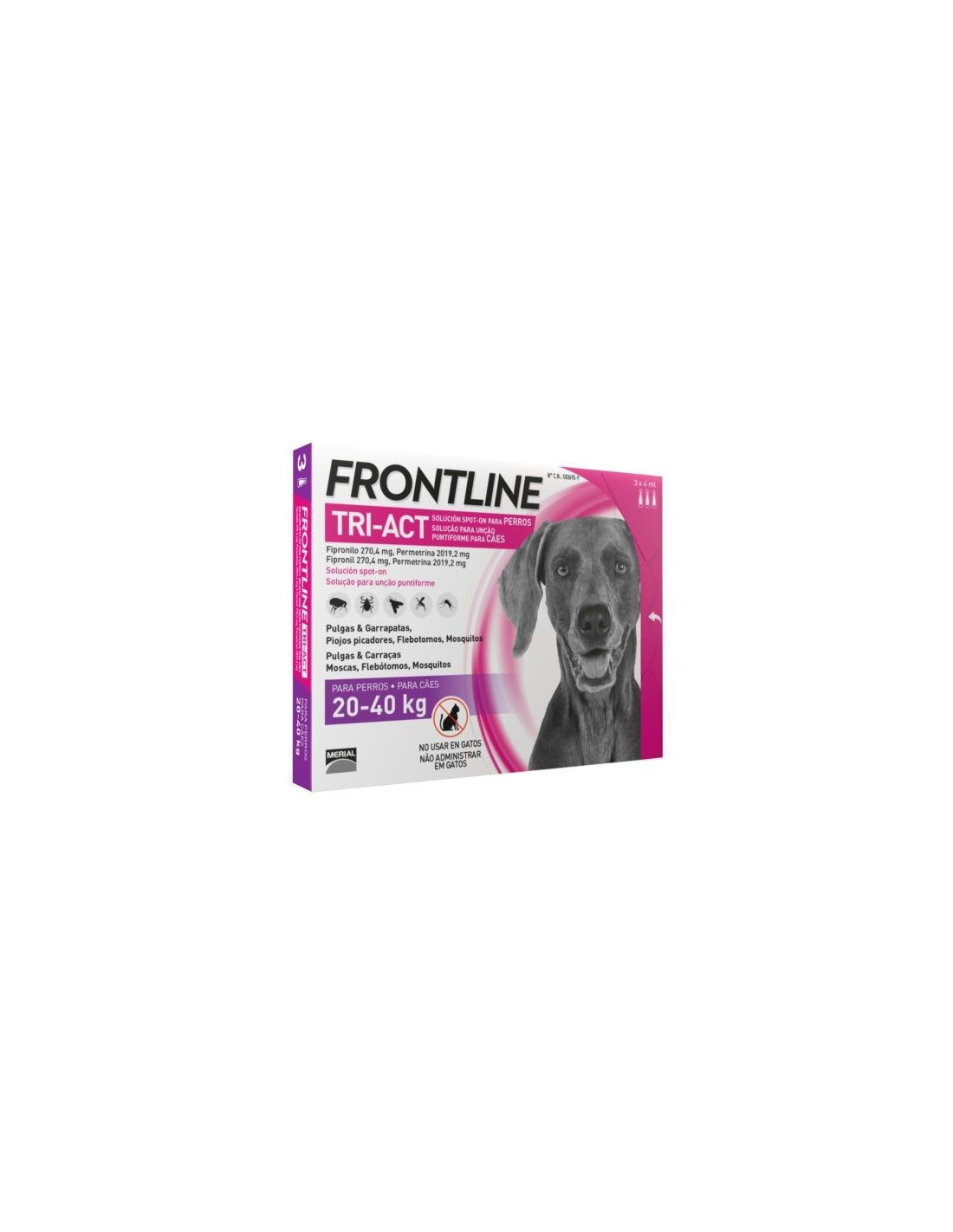 Fronline Tri-Act para perros de 20 a 40 kg está disponible en envases de 3 y 6 pipetas desparasitarías de protección total. Cada pipeta contiene 2 ml.