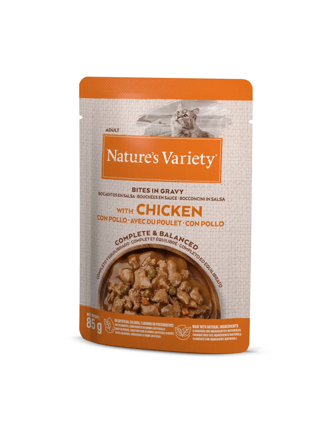 Nature's Variety Bocaditos en salsa con pollo. Cocidos al vapor a temperatura óptima en su propio jugo para preservar mejor los nutrientes.