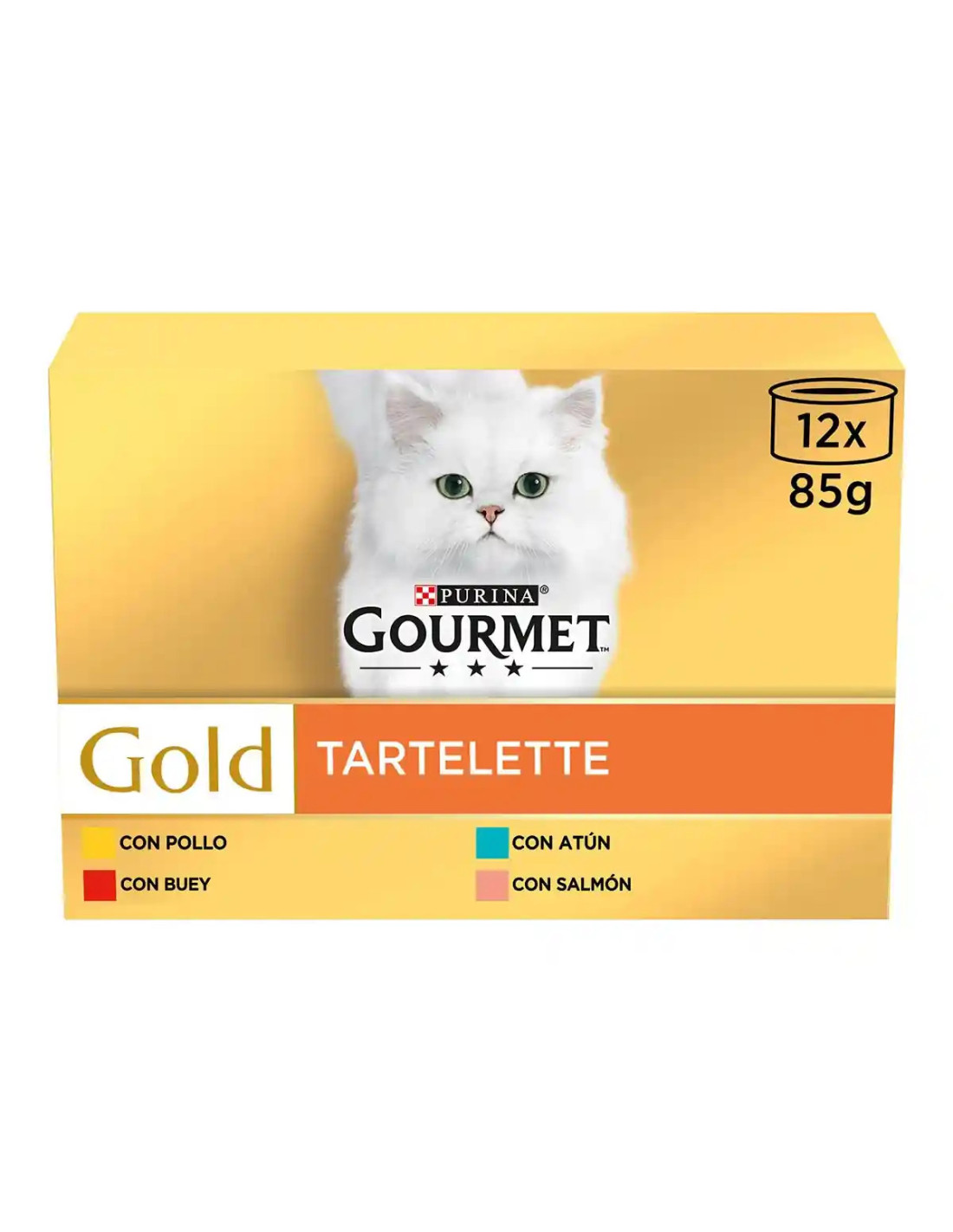 Pack 12 Latas Purina Gourmet Gold Tartelette, es una comida húmeda premium diseñada para gatos adultos que buscan una experiencia gastronómica exquisita. Elaborada con ingredientes de alta calidad, esta gama ofrece trocitos delicadamente cortados de carne (pollo, buey) o pescado (salmón, atún), acompañados de un toque de salsa y verduras, creando una textura única en forma de pastel que deleitará a tu felino 123.una selección de deliciosas latas con textura mousse, suaves y deliciosas. Un alimento nutritivo e hidratante para gatos, elaborado con los mejores ingredientes para encartar a tu gato.