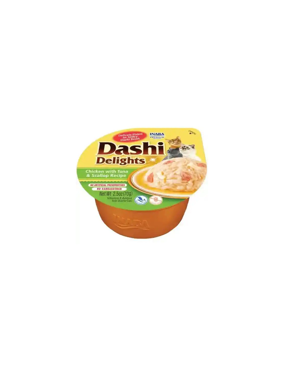 Dashi Delights de pollo y atún con vieira para gatos, es una comida excepcionalmente deliciosa, hidratante y nutritiva para tu gato. El Dashi, elaborado algas y copos de bonito Dashi, les la base de la cocina japonesa, un caldo muy ligero y potenciador del sabor. Este manjar único, rico en proteínas animal, no contiene cereales, aditivos o ingredientes artificiales.