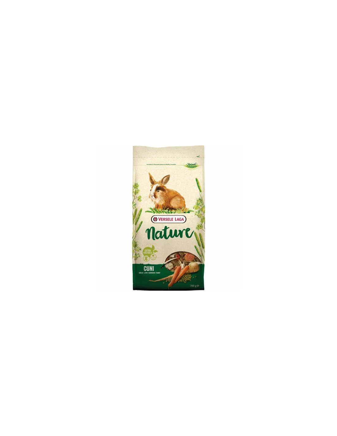 La comida para conejos Versele-Laga Nature Cuni está compuesta por una cuidada selección muy variada de verduras, fruta, fibras, hierbas y suplementos nutricionales que favorecen a su aparato digestivo, cuidan sus dientes y le dan a su pelaje un saludable aspecto y brillo. También tiene extractos de yuca que fijan el amoniaco y reduce el mal olor de heces y orina. No contiene cereales.