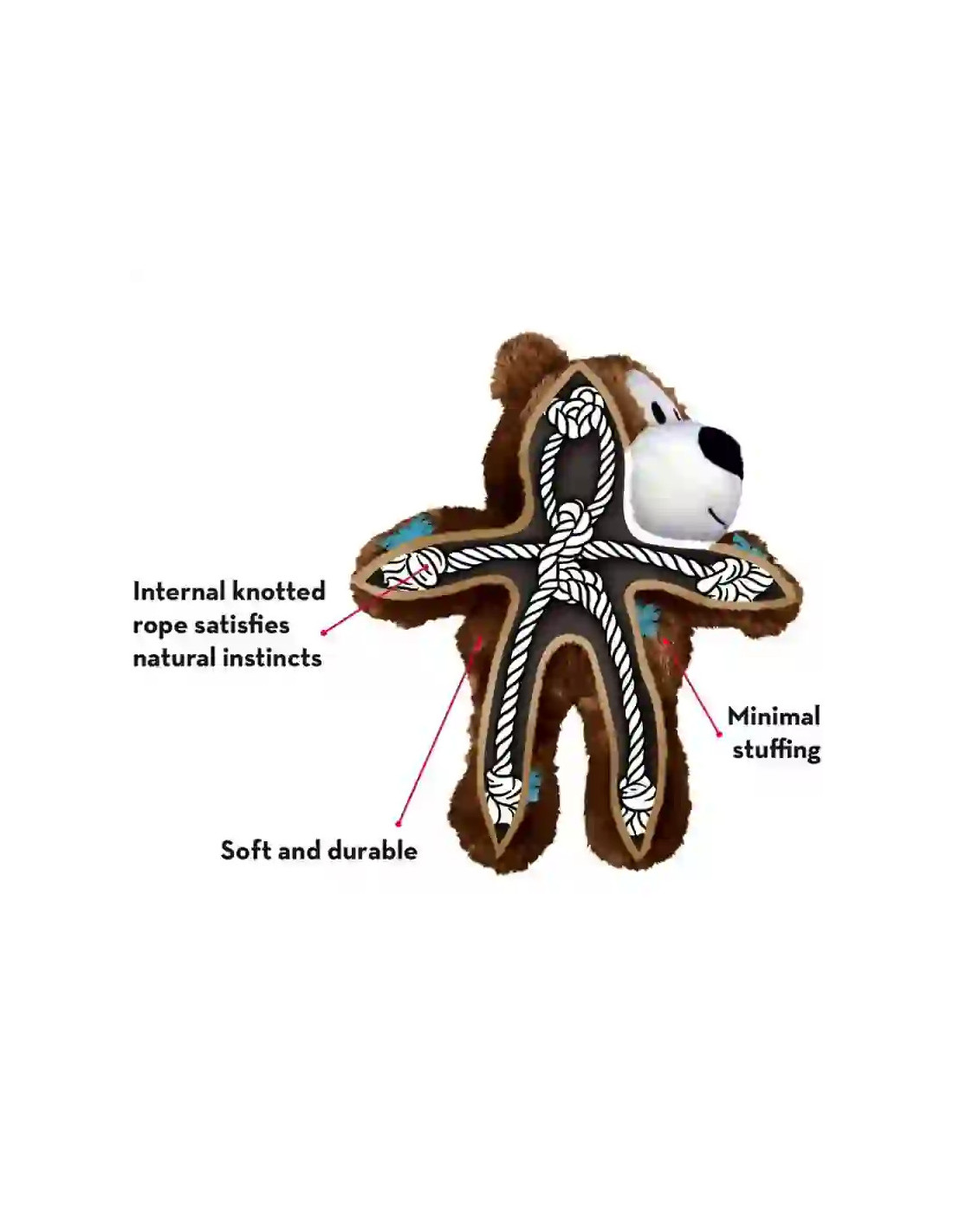 Peluche Kong Wild Knots será el tierno compañero de juegos perfecto para tu mascota. Elaborado con materia muy suave por fuera y muy resistente por dentro. El oso está relleno de un esqueleto de cuerda con nudos, lo que lo convierte en un juguete resistente y duradero. Además contiene un chirriador interior, que emite un sonido al morderlo, para incentivar el juego aún mas.