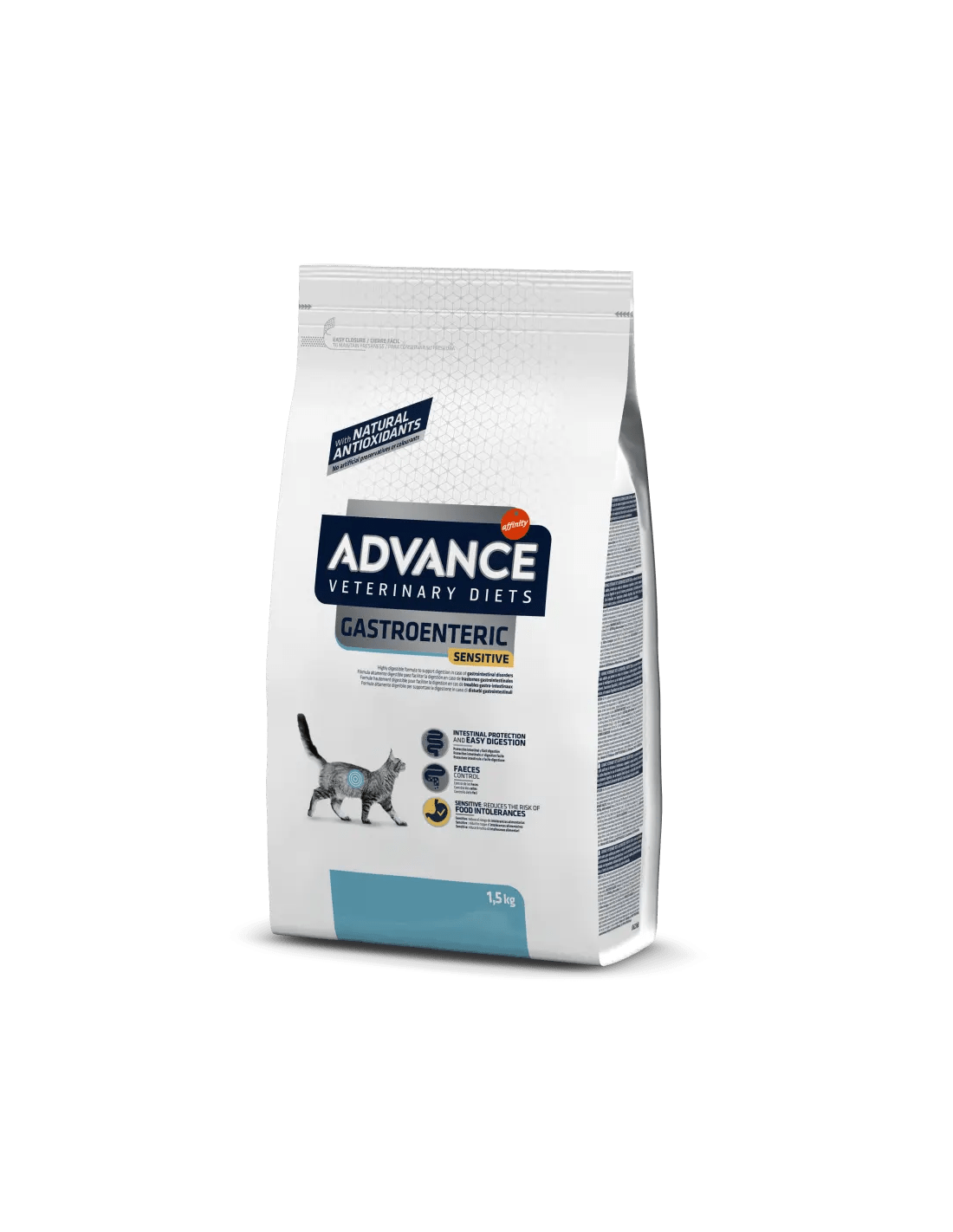 ADVANCE VETERINARY DIETS Gastroenteric Sensitive es un alimento dietético completo para gatos adultos que ayuda compensar las alteraciones de la digestión en caso de trastornos gastrointestinales y de insuficiencia pancreática exocrina. Está formulado con ingredientes altamente digestibles, moderados niveles de grasa, nivel incrementado de sodio y potasio. Con fuentes seleccionadas de proteínas y carbohidratos para disminuir el riesgo de reacciones adversas al alimento.