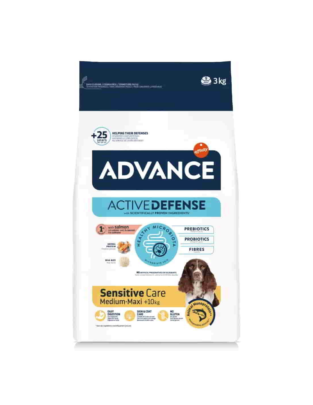 Advance Adult Sensitive rico en salmón y arroz, especialmente indicado para perros adultos de todas las razas , con intolerancia a la proteína de la carne y a otros ingredientes asociados frecuentemente a la sensibilidad alimentaria.