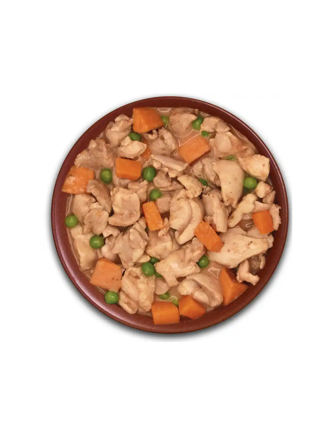 97% pollo fresco en su salsa, boniato, guisantes, zanahoria, especias.