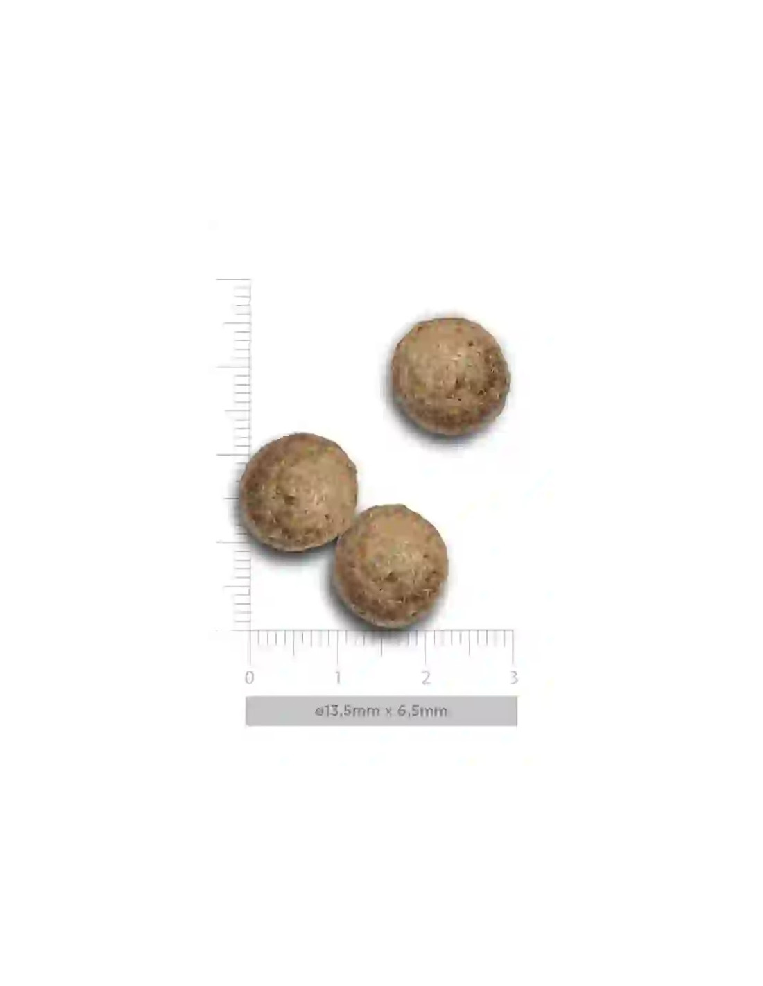 Pollo deshidratado 12,4%, pavo deshuesado preparado en fresco 8,5%, arroz extrusionado, guisantes verdes enteros, pavo deshidratado 8,3%, avena integral 8,3%, arroz integral 8%, aceite de pollo (protegido con tocoferoles naturales) 6,9%, guisantes amarillos enteros, pollo deshuesado preparado en fresco 4,1%, cebada integral 4,1%, hígado de pollo preparado en fresco 3,3%, pato deshuesado preparado en fresco 2,6%, hígado de pollo hidrolizado 1,6%, pato deshidratado 1,5%, pulpa de remolacha, fibra de manzana, hígado de pavo hidrolizado 0,8%, minerales, semillas de lino (fuente natural de ácidos grasos ω3) 0,5%, aceite de pescado (protegido con tocoferoles naturales) 0,5%, levaduras (Saccharomyces cerevisiae), brócoli fresco 1000 mg/kg, calabaza fresca 1000 mg/kg, manzanas frescas 1000 mg/kg, zanahorias frescas 1000 mg/kg, glucosamina 1000 mg/kg, condroitina 600 mg/kg, pared celular hidrolizada de levaduras (fuente de MOS) 500 mg/kg, achicoria (fuente de FOS) 500 mg/kg, extracto de mandarina 400 mg/kg, Yucca schidigera 200 mg/kg, alga kelp 30 mg/kg, arándanos rojos enteros 30 mg/ kg, rosa canina (rica en vitamina C) 30 mg/kg, té verde 30 mg/kg, cúrcuma 30 mg/kg.