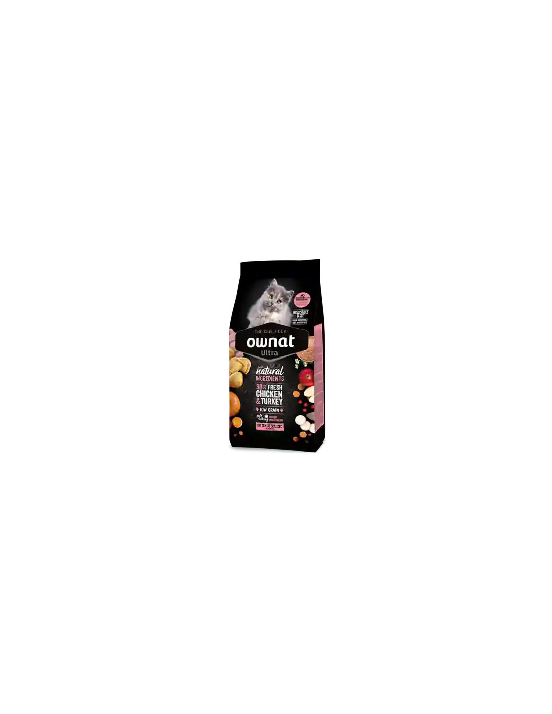 - Sin conservantes ni colorantes. Ownat Ultra Kitten Sterilized apuesta por una alimentación más natural, sin aditivos artificiales, contribuyendo al bienestar general del gato.
