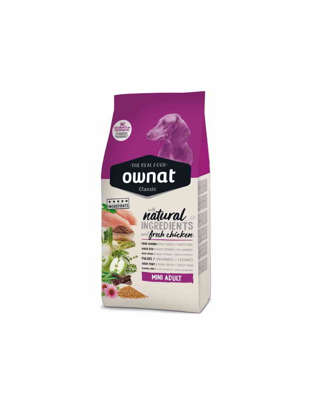Pienso Ownat Classic Mini Adult, es un alimento especialmente diseñado para perros de razas pequeñas entre 1 kg y 10 kg en edad adulta. Con levados aportes calóricos y muy rico en proteínas para dar respuesta a los altos requerimientos de las razas mini. Sus croquetas de forma y tamaño reducidos así cómo su gran apetitosidad lo hace adecuado para los paladares más caprichosos.