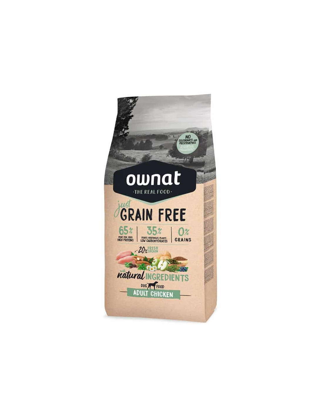 Pienso para perros, Ownat Just Grain Free Adult Chicken, es un pienso destinado a perros adultos de todas las razas, está elaborado con un 20% de carne fresca y muy rico en ingredientes de origen animal, que aportan proteínas de la máxima calidad, un sabor y una apetencia excepcionales y aseguran un mayor aprovechamiento de los nutrientes.