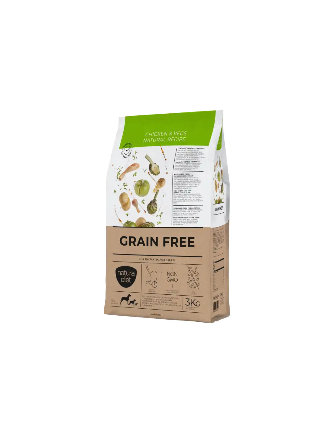 Natura Diet Grain Free Chicken & Vegs es un alimento completo sin cereales para perros adultos, elaborado con pollo y verduras, ideal para una nutrición equilibrada y una digestión adaptada.