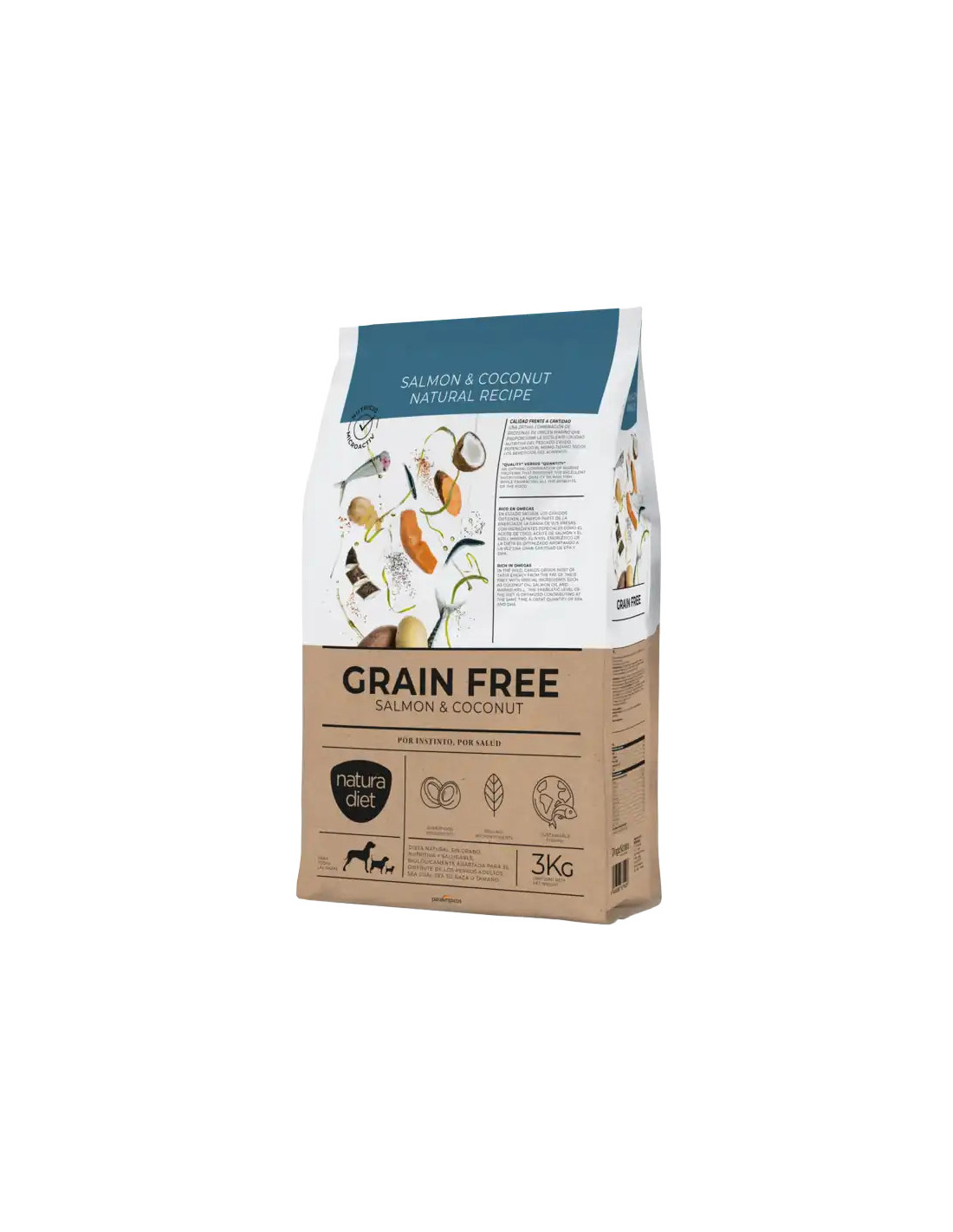 Natura Diet Grain Free Salmon & Coconut es un alimento completo sin cereales para perros adultos, elaborado con salmón, aceite de coco y vegetales, ideal para una nutrición equilibrada y digestiones sensibles.