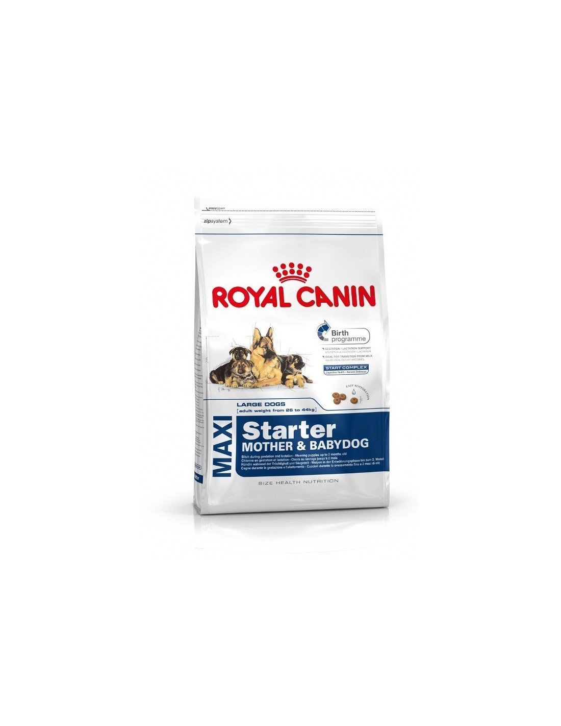 Royal Canin Maxi Starter está indicado para madres de tamaño maxi en la fase final de gestación o en periodo de lactación así como para cachorros en periodo de destete hasta los 2 meses de edad de perros de tamaño Maxi (26-44 kg).